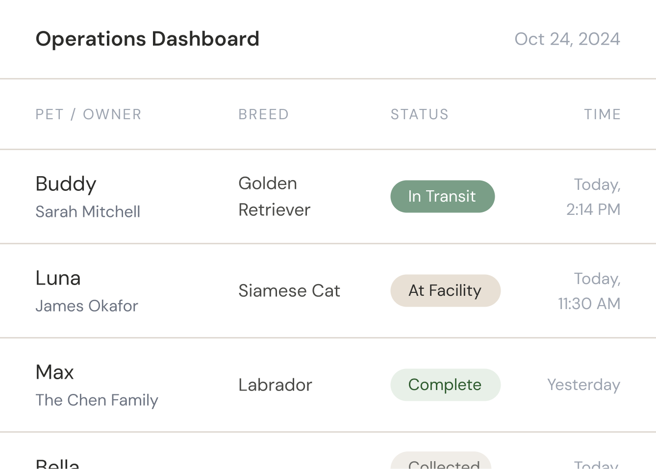 A QR label travels with every pet, scanned at every handoff to ensure a perfect chain of custody. No more paper logs or guesswork.